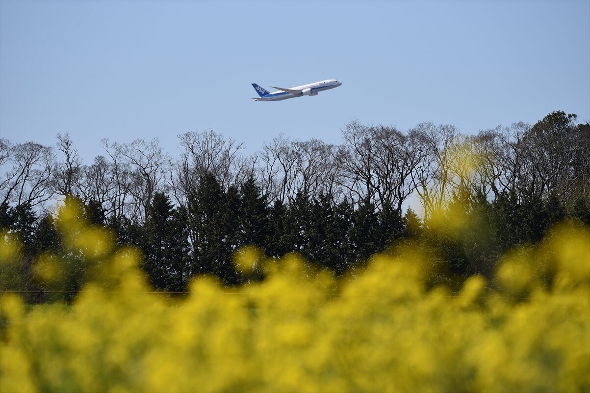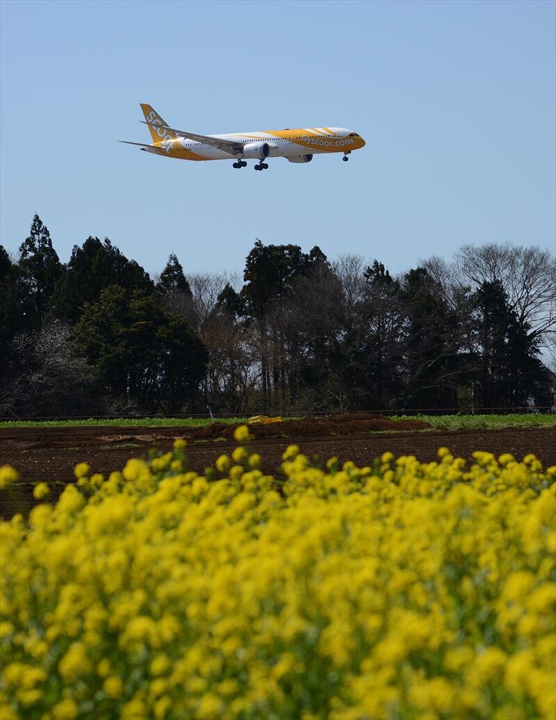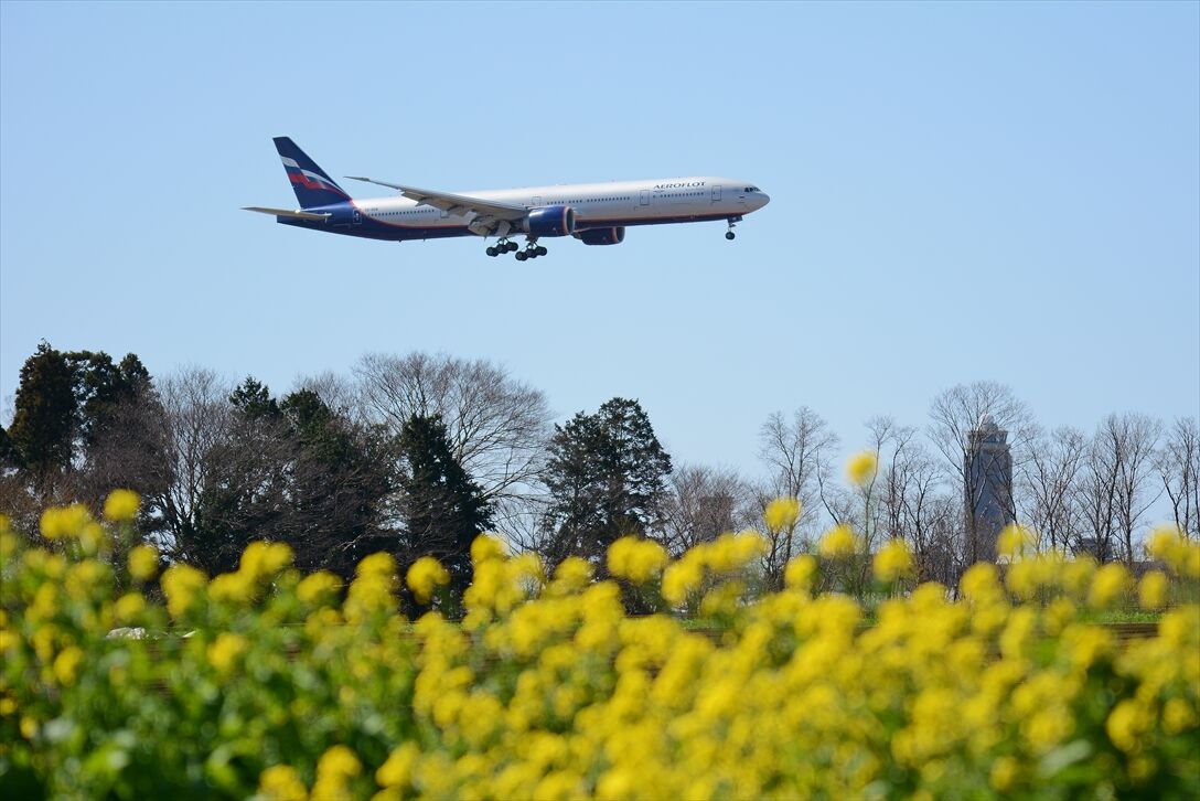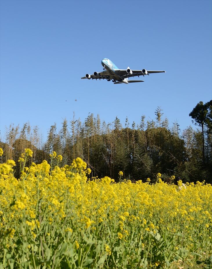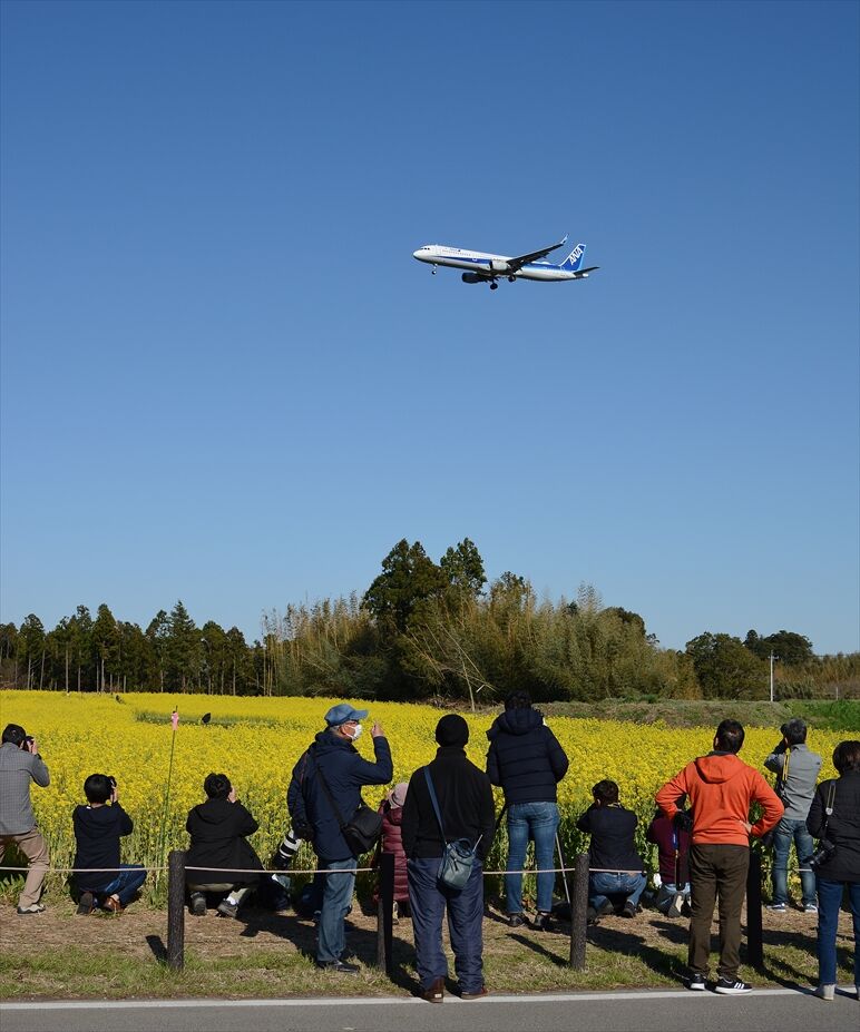 2020年03月22日 空の駅、しばやま 先日の成田では聖火輸送機が下りた後、カメさんの降りを撮りに菜の花が満開の空の駅へ。カメさんの後にNCAのB747が着陸。菜の花園はコロナウイルスもなんのその賑わっていた。