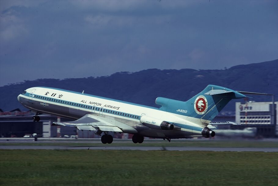 32Lを離陸するモヒカンルックのB727-200、背景に見える全日空マークの格納庫やS-1ビルは解体されてしまって面影は無い。