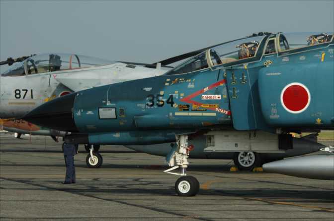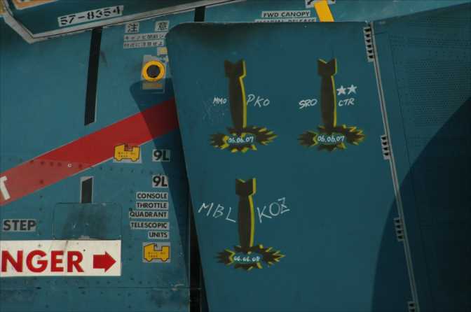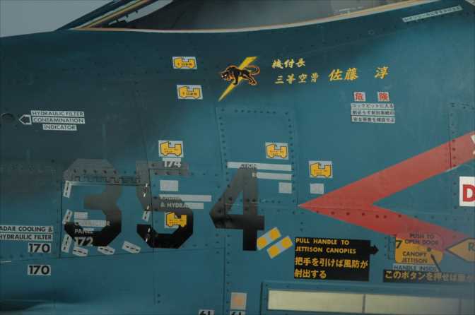 2025年04月30日 ファントム回顧録、2006年、2007年入間 2006年11月3日の入間航空祭には、前年に続いてFー4は三沢の8sqからで、三沢航空祭にも展示された354号機が来た。三沢ではタラップが邪魔になって良く見えなかった、爆弾マークがはっきりと見えた。実弾(多分1000ポンド)を」投下したとおもわれる日付けが描いてあった。爆弾の両側に描いてある略語は墜としたパイロットのTACネームだろう。 2007年の入間航空祭には同じく三沢の8sqのFー4、317号機が参加、変わり映えのしない通常塗装だったのか1枚しか画像が見当たらない。