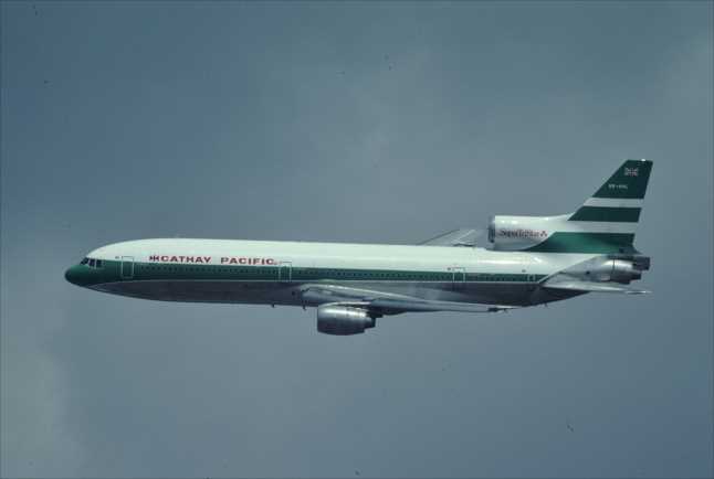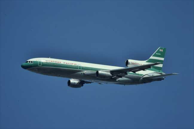 伊丹の32Lを離陸したCXのL1011、N321EA、イースタン航空からのリース機。国内線に比べると思いせいか低い高度で旋回するので陸自中部方面総監部付近からは良い感じで撮れた。1985年12月。