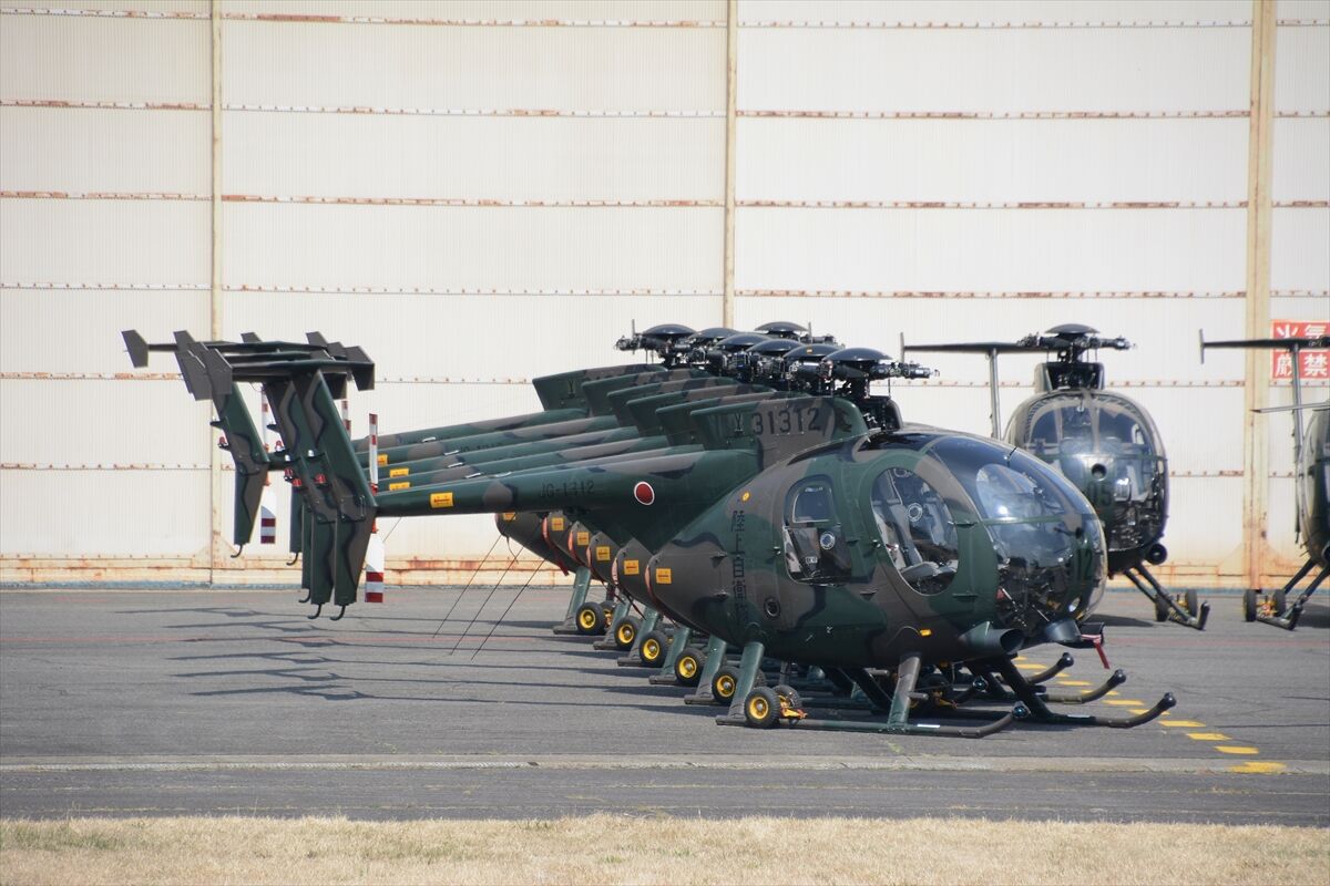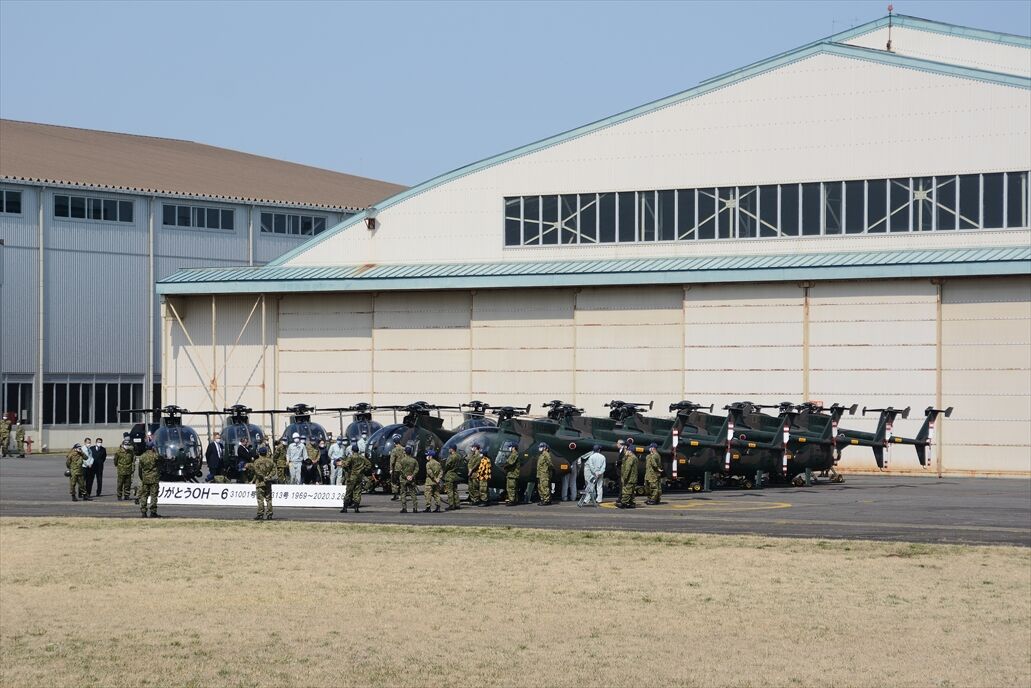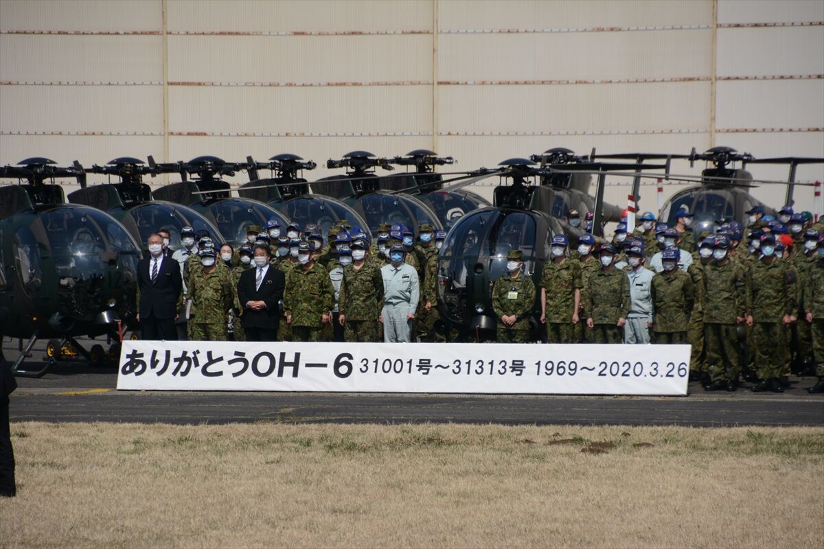 10時半過ぎに着陸後、既に用廃になったOH-6Dを16機も格納庫から出して並べて記念撮影が行われた。