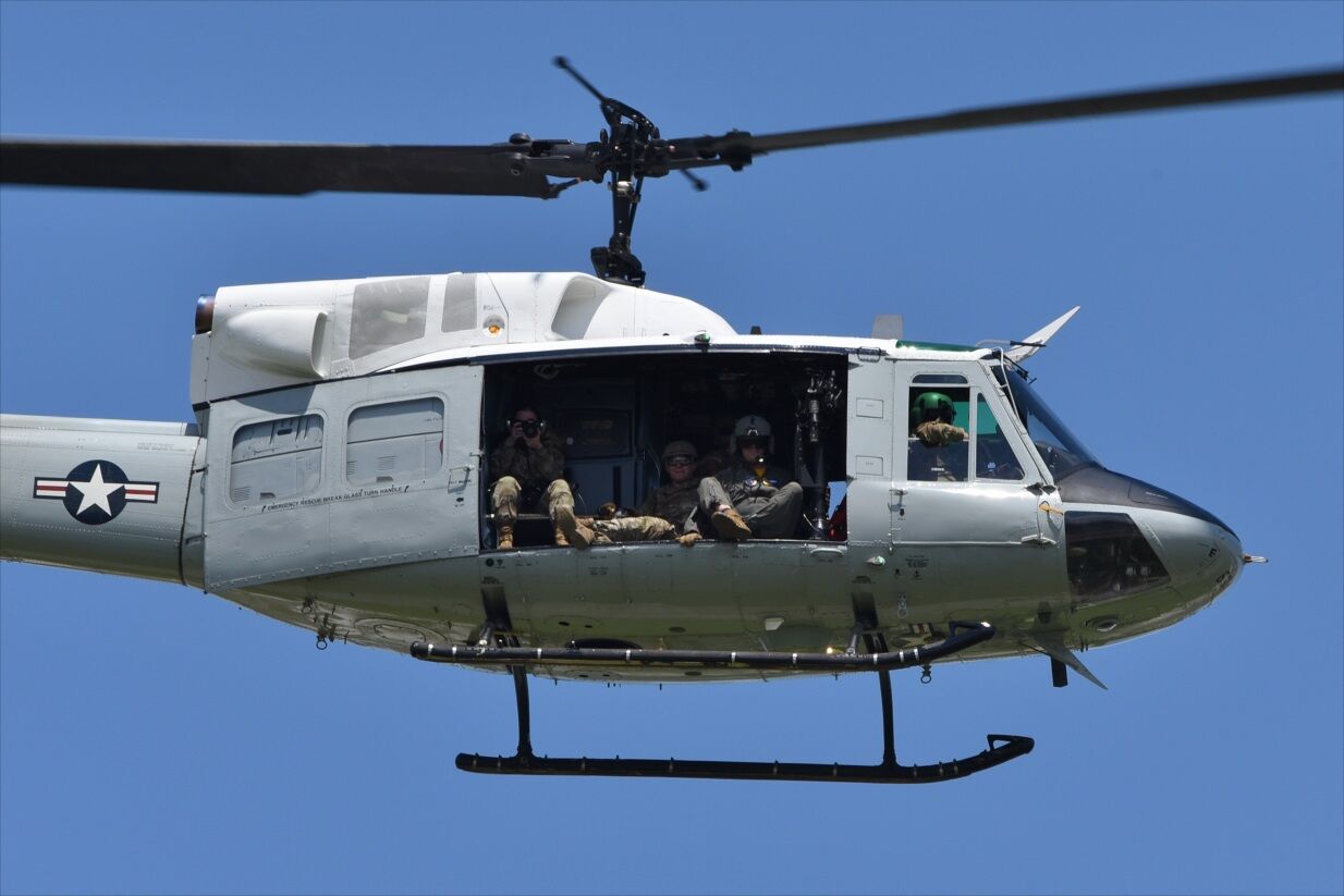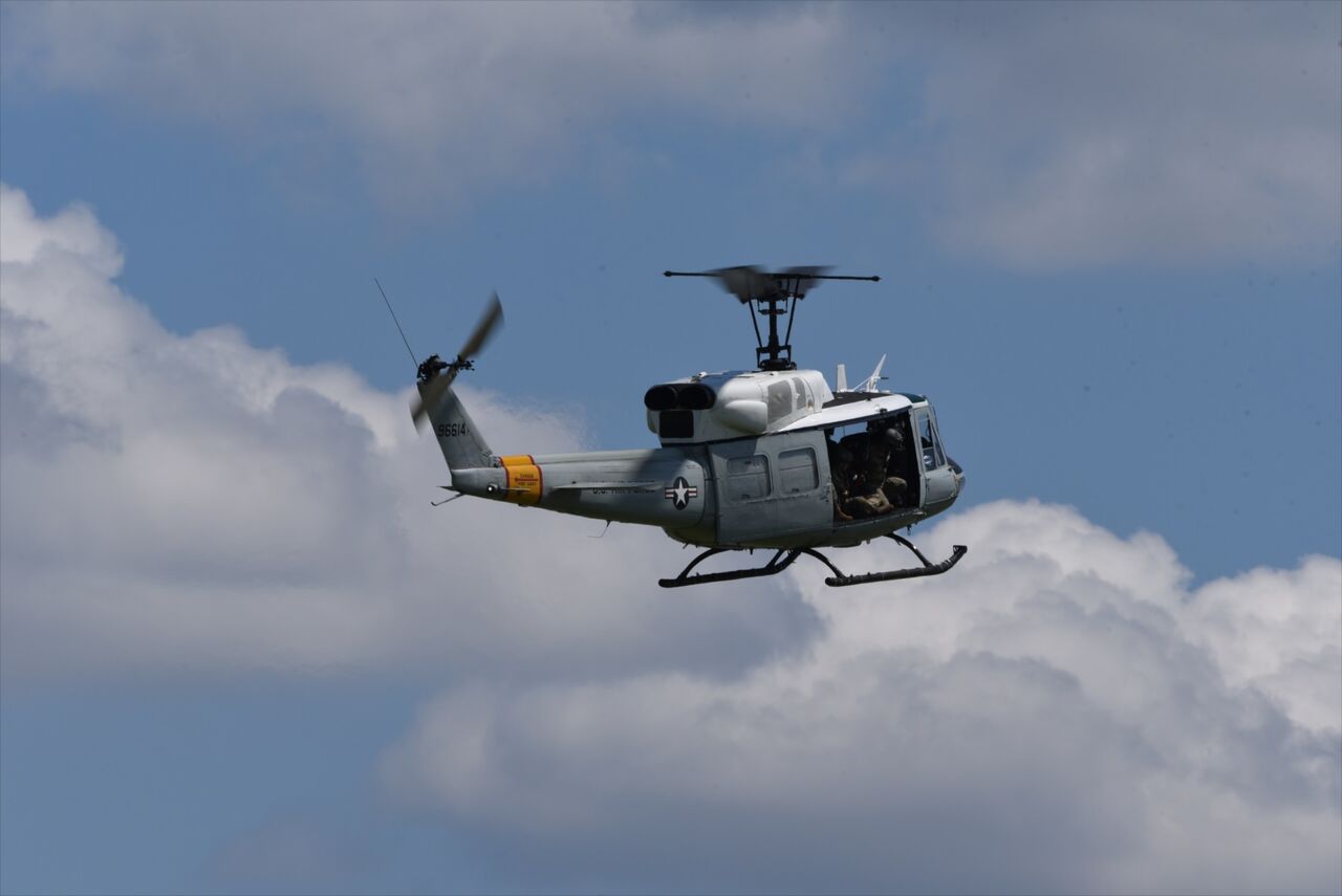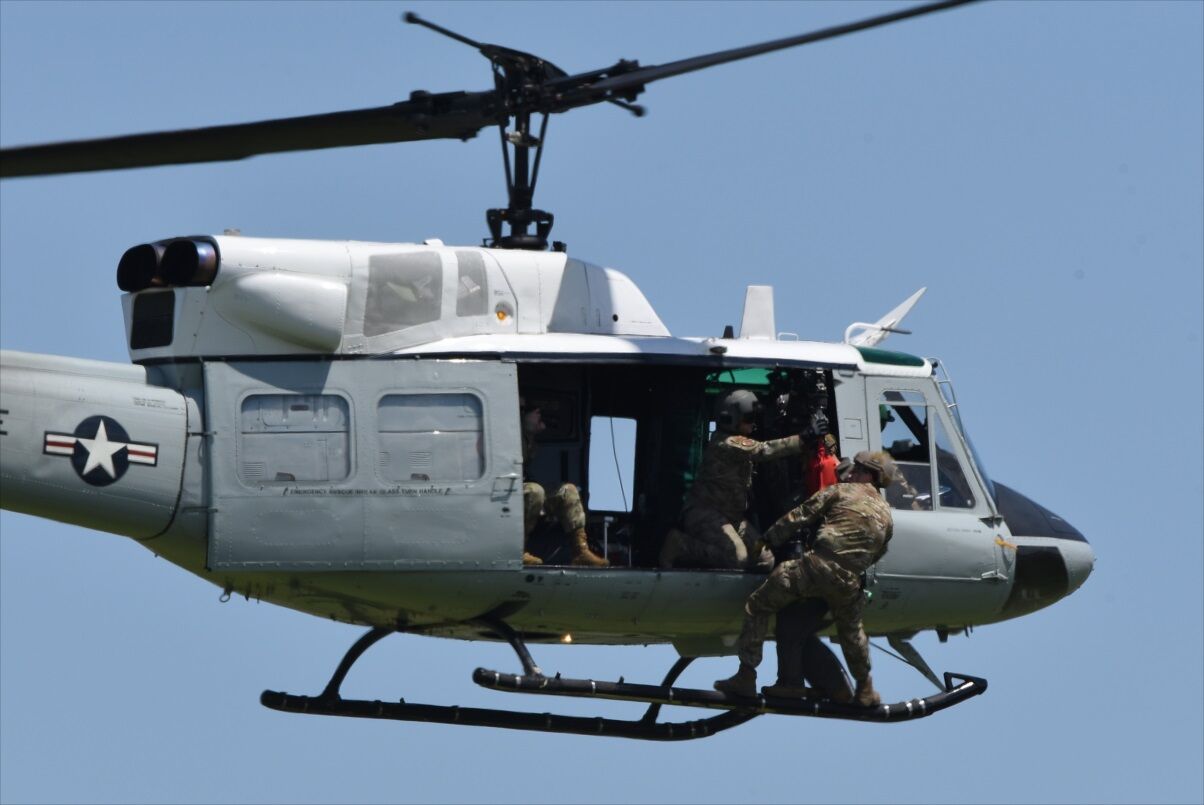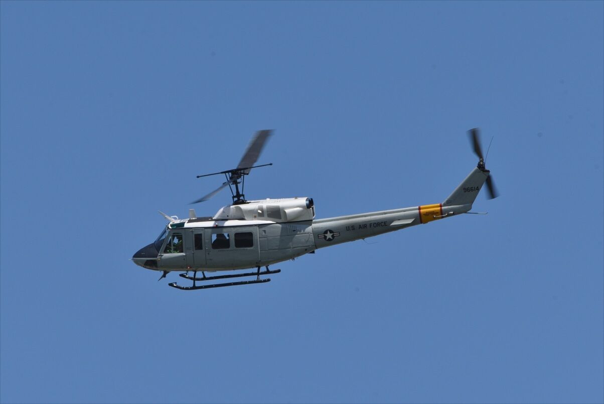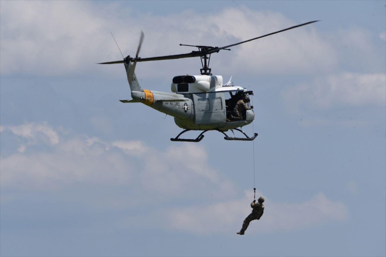 2022年06月07日 横田公開、UHー1 地元ヘリのUHー1もデモフライト、ベトナム戦争末期はHHー43がレスキュー任務に就いていたが、その後UHー1になり、バージョンアップされているが息の長いヘリだ。 ホイスト降下。 吊り上げ。 左側にいるのはカメラマン、こちらにレンズを向けている。